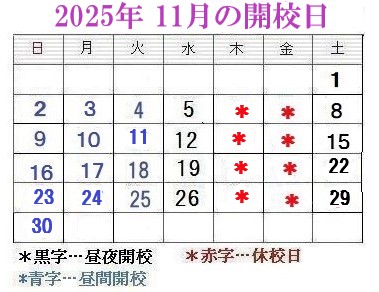 □月・火・日曜日は、 昼間のみの開講です。 □水・土曜日は 昼夜開講です。 ■木・金曜日は休校日です。