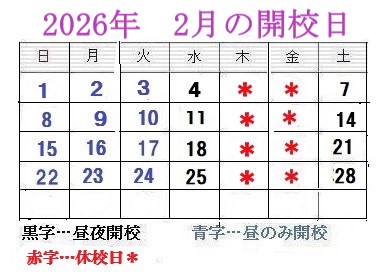 □日・月・火曜日は、 昼間のみの開校です。 □水・土曜日は、 昼夜開校です。 ■木金曜日は休校日です。
