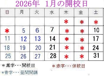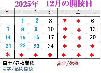 □月・火・日曜日は、 昼間のみの開講です。 □水・土曜日は 昼夜開講です。 ■木・金曜日は休校日です。
